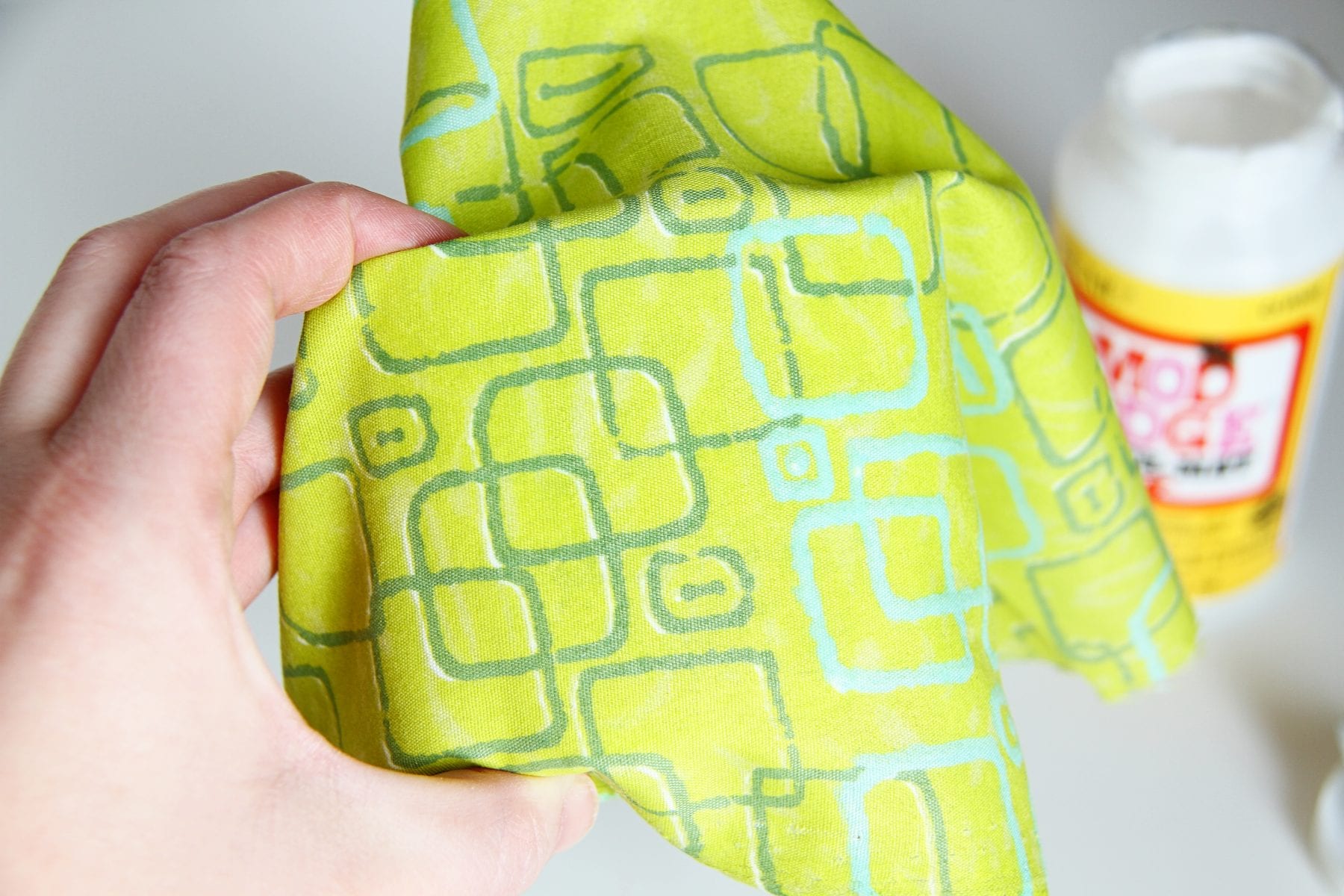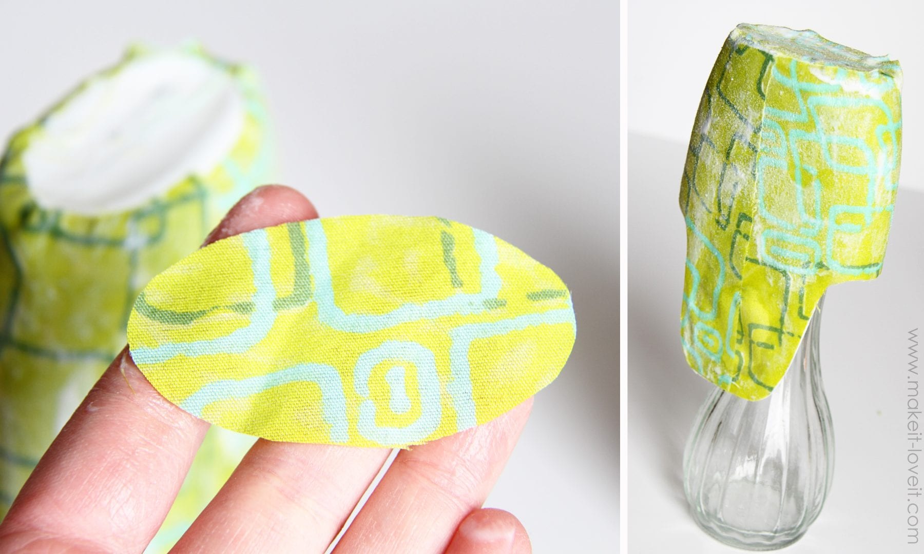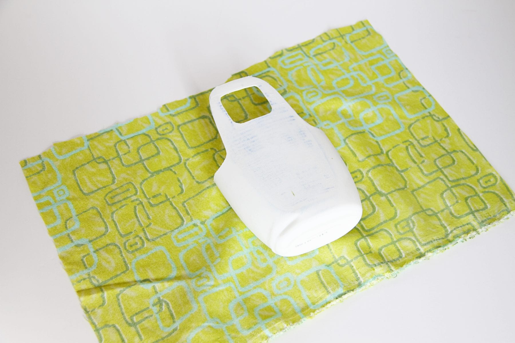 Then, apply more Mod Podge around the side of the container and continue to lay the fabric down right against it, pulling tightly as you wrap. Also, be sure to pull the fabric down around the curve of the bottom of your bottle, if needs be. This will help keep the fabric flat and smooth. Use plenty of Mod Podge to aide you in this process.