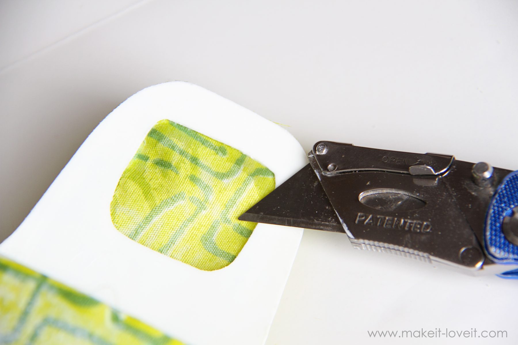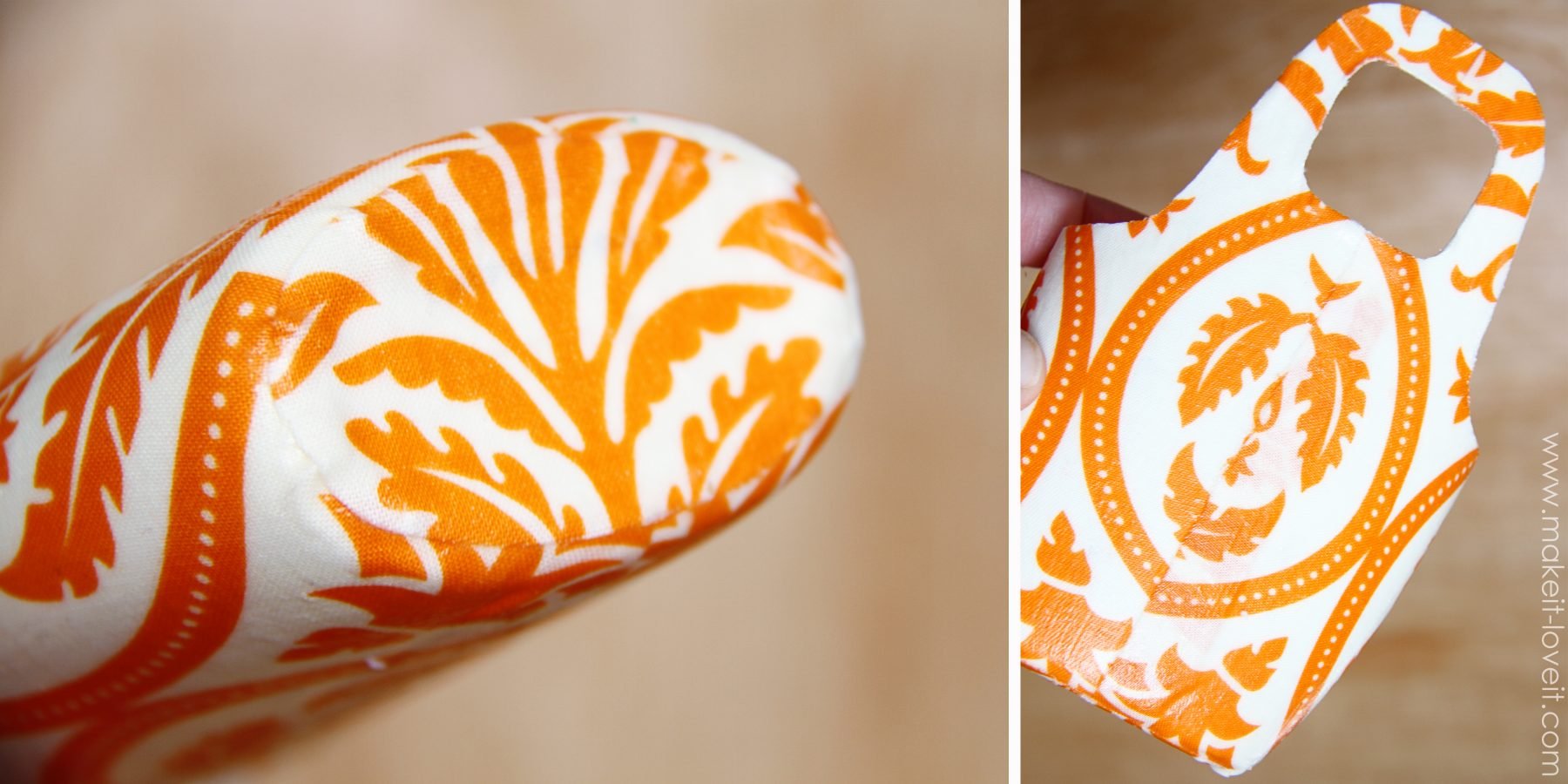 Now, don’t worry if your edges aren’t smooth and have little pieces of fabric sticking off. Use your box cutter/exacto knife and run the blade right along the edge of the phone holder all the way around, to remove any stray threads or chunks of dried Mod Podge.