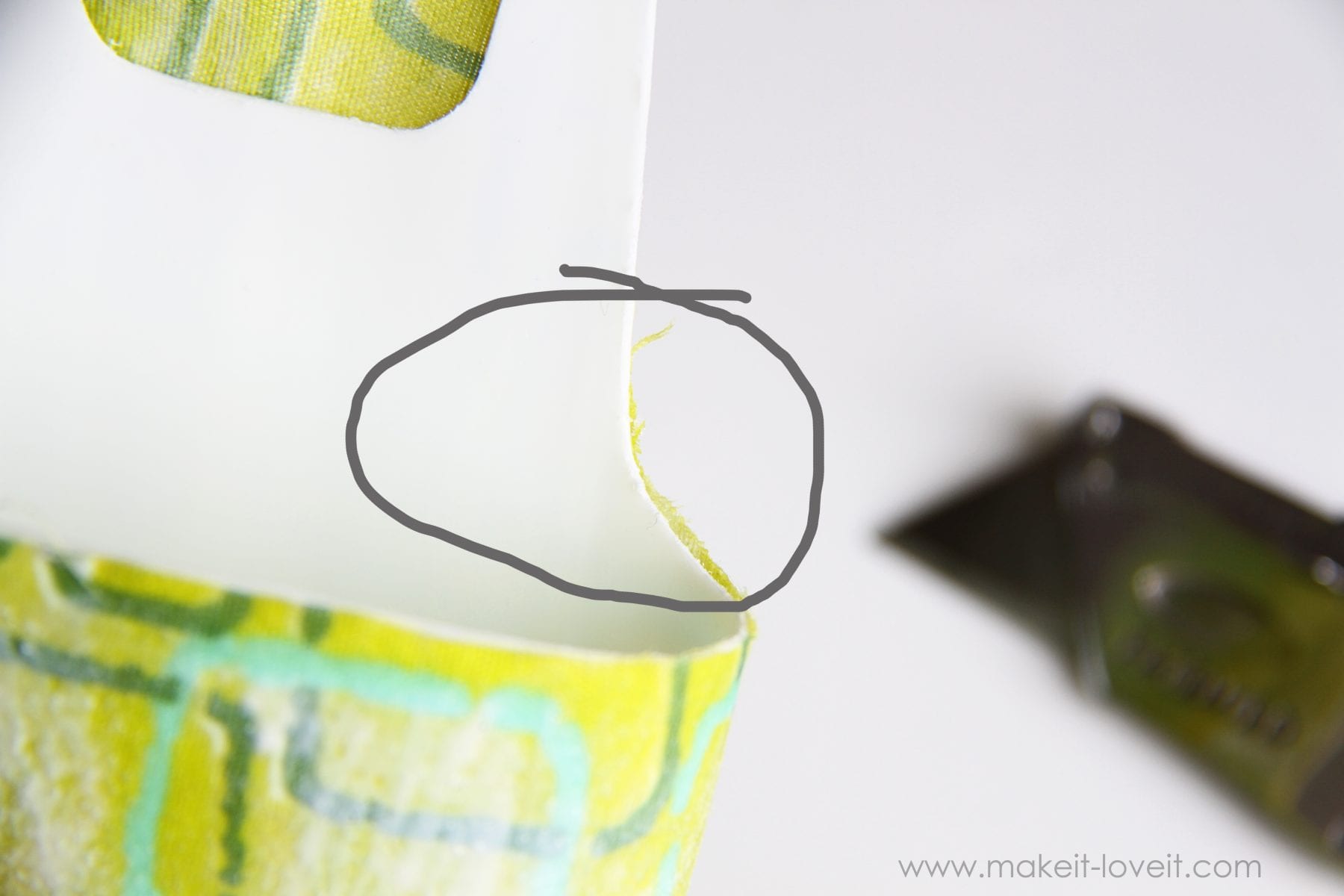 Once it’s dry, use a box cutter/exacto knife to cut out the square-ish opening. You’ll probably need to apply more Mod Podge around the opening and allow it to dry again.