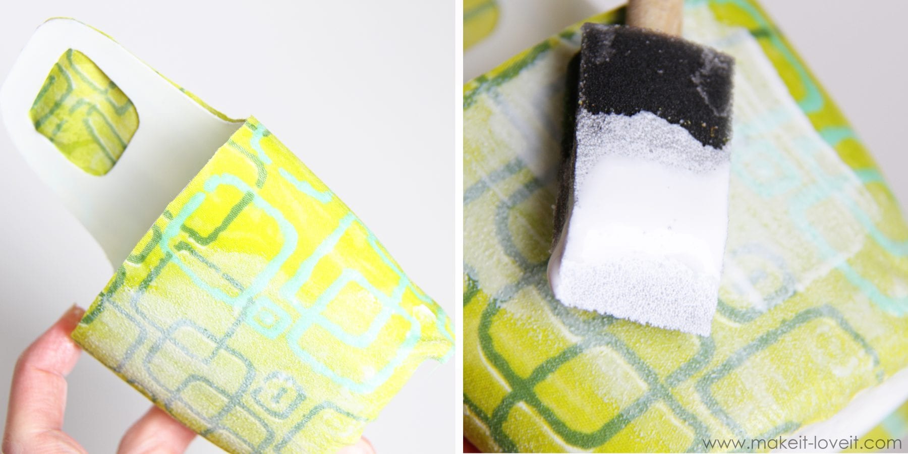 Then, I turned the phone holder with the front facing me, and applied a generous layer of Mod Podge to the front.